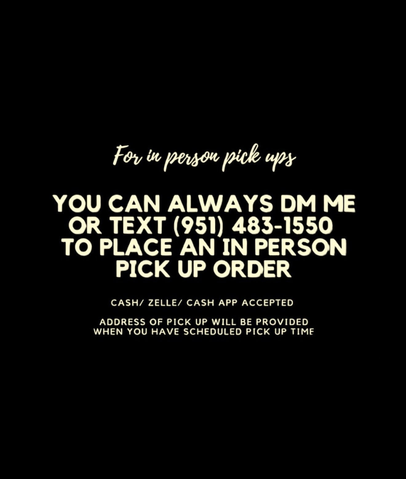 Feel free to DM me on Instagram or text 9514831550 Let me know what you would to order & when you want to pick up